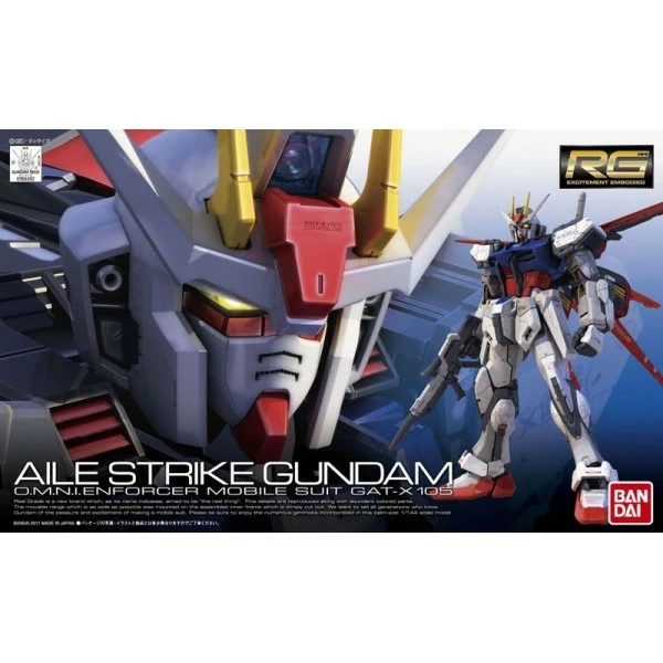 The third kit in the Real Grade line is the GAT-X105 Aile Strike Gundam. Â Bandai gives the Strike some REAL attention! It comes with a shield, beam rifle, two beam sabers, plenty of marking stickers, and an adaptor so it can fit on an Action Base 1, and most importantly off all, that amazingly engineered Advanced MS Joint frame!